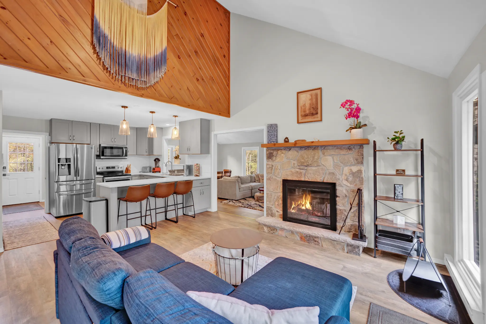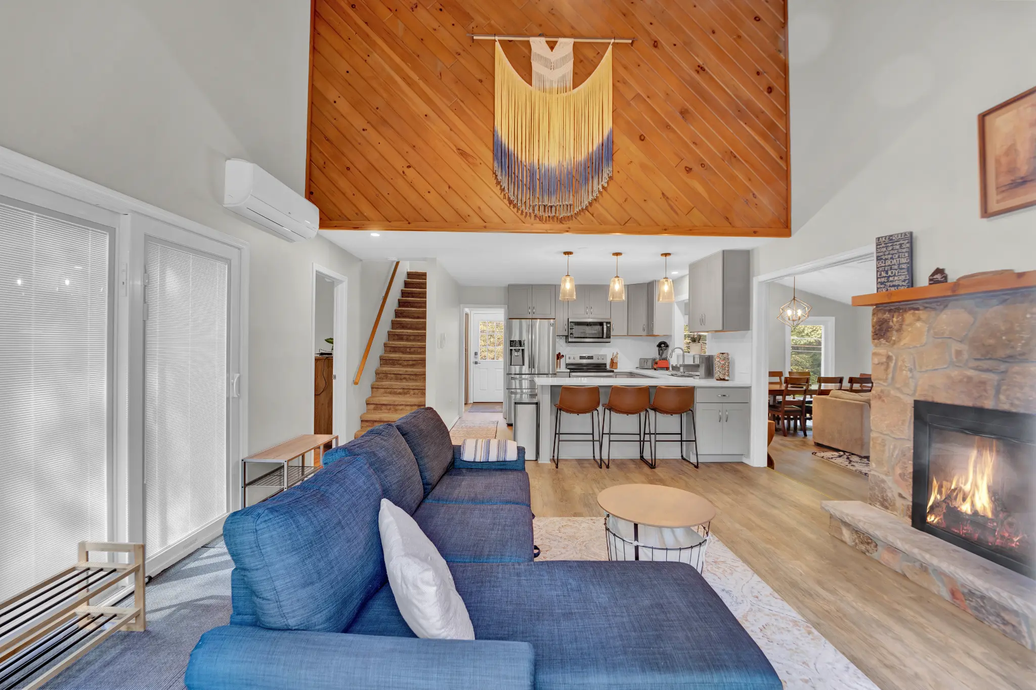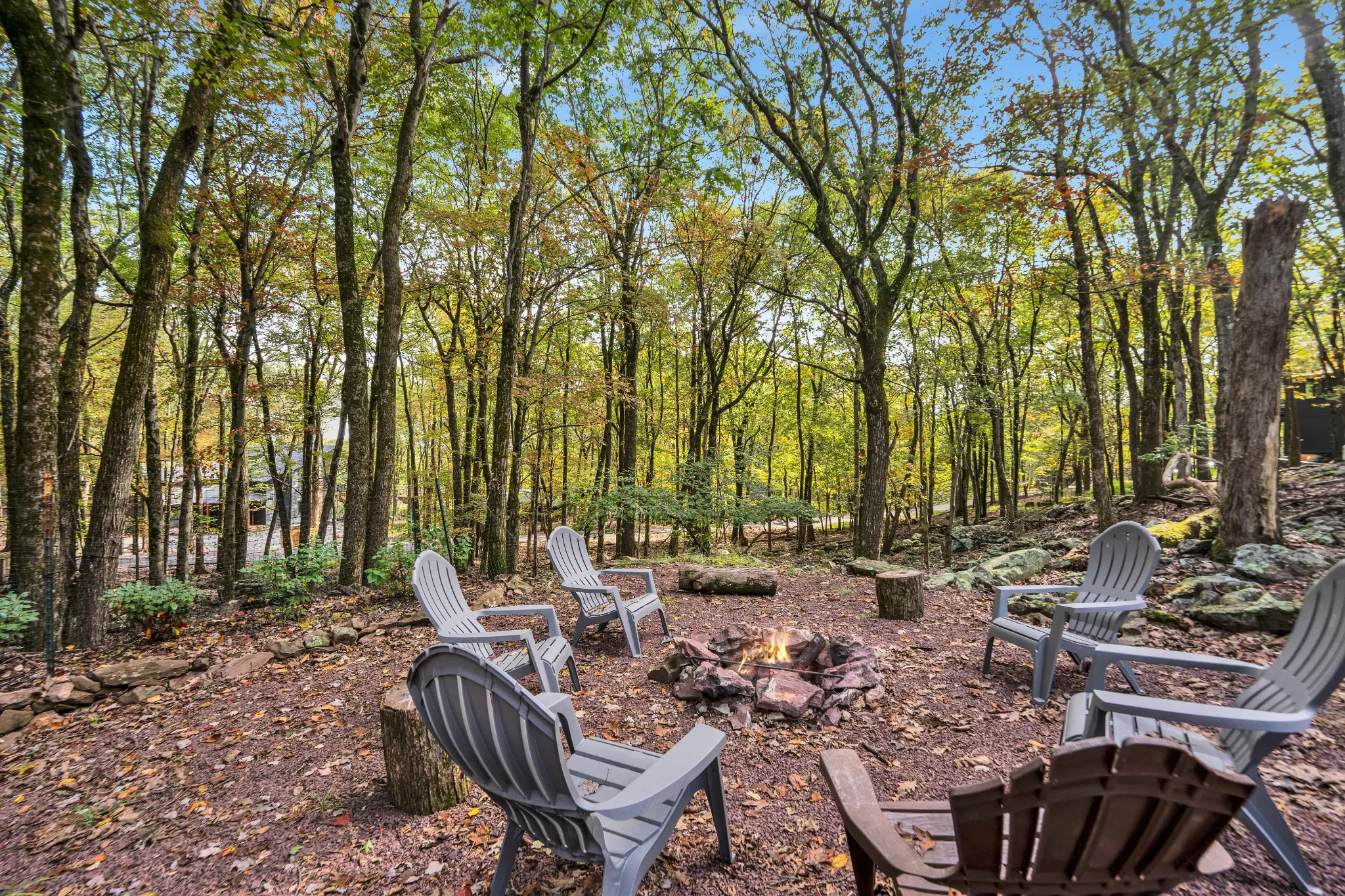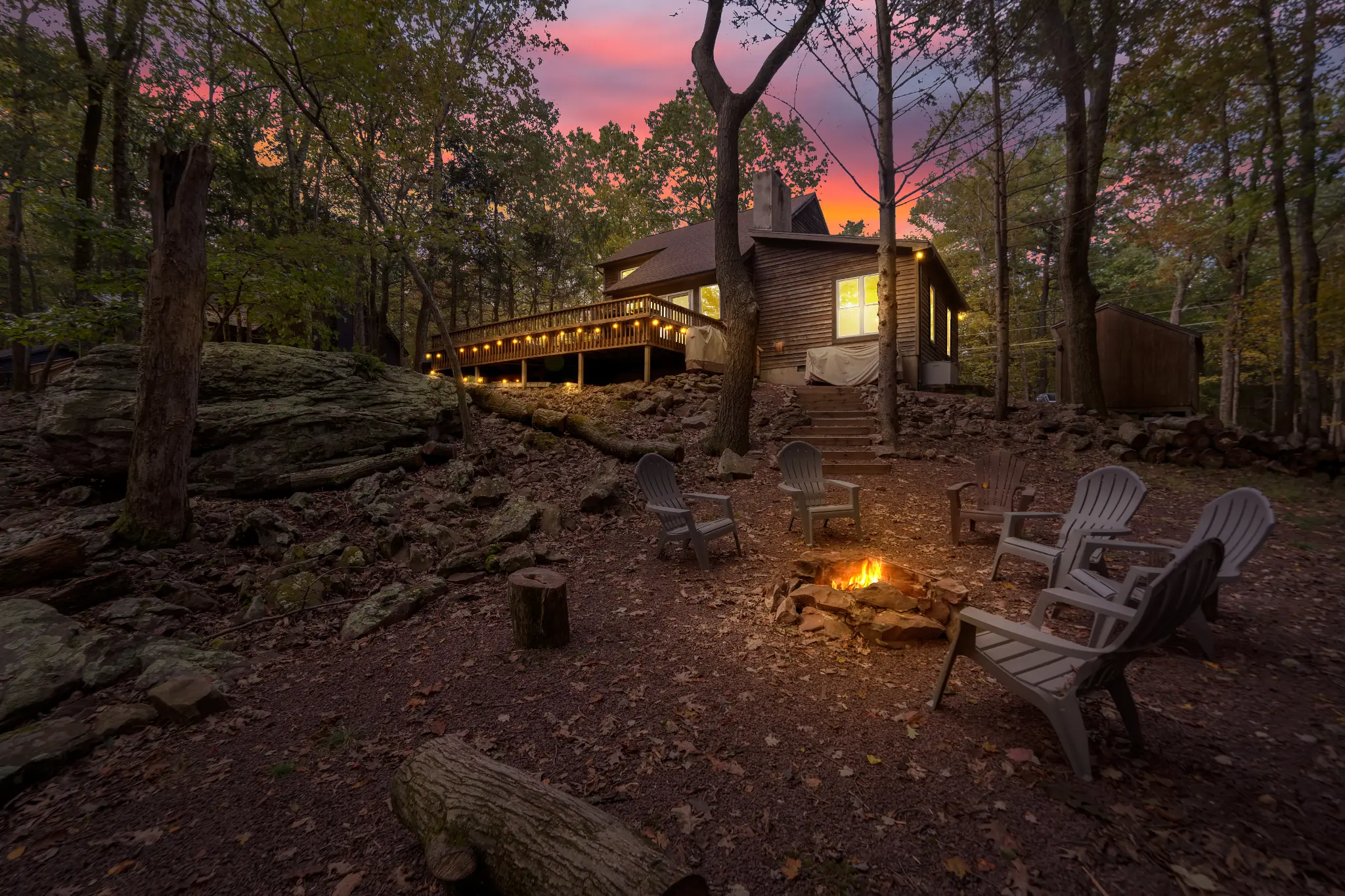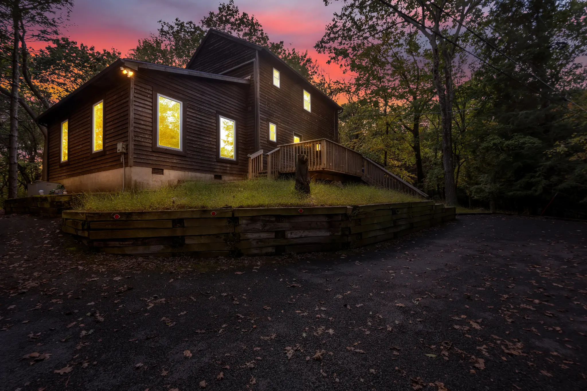 Escape to a rejuvenating mountain retreat in Lake Harmony Estates. This newly renovated 3-bedroom, 3-bath home features a wraparound deck, private hot tub, and fire pit with wood provided. It’s perched on top of a hill so you have a bird’s eye view of the forest! Enjoy bucks and deer as they come walking up to you in this wooden paradise. With lake access, hiking, and skiing, there is plenty to do! The house includes a unique black light forest room, Smart TVs, and a well-stocked kitchen.